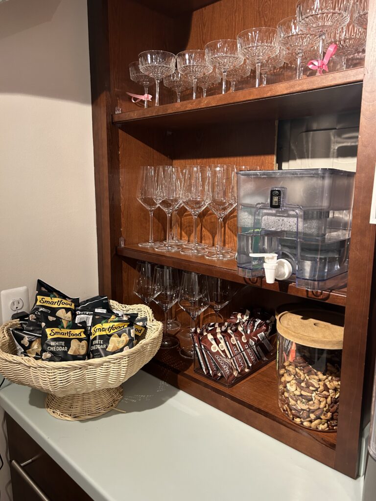 There is a kitchen with complimentary drinks, coffee, light snacks, and water. There are also some stronger drinks on the bar cart, but those are available for events.