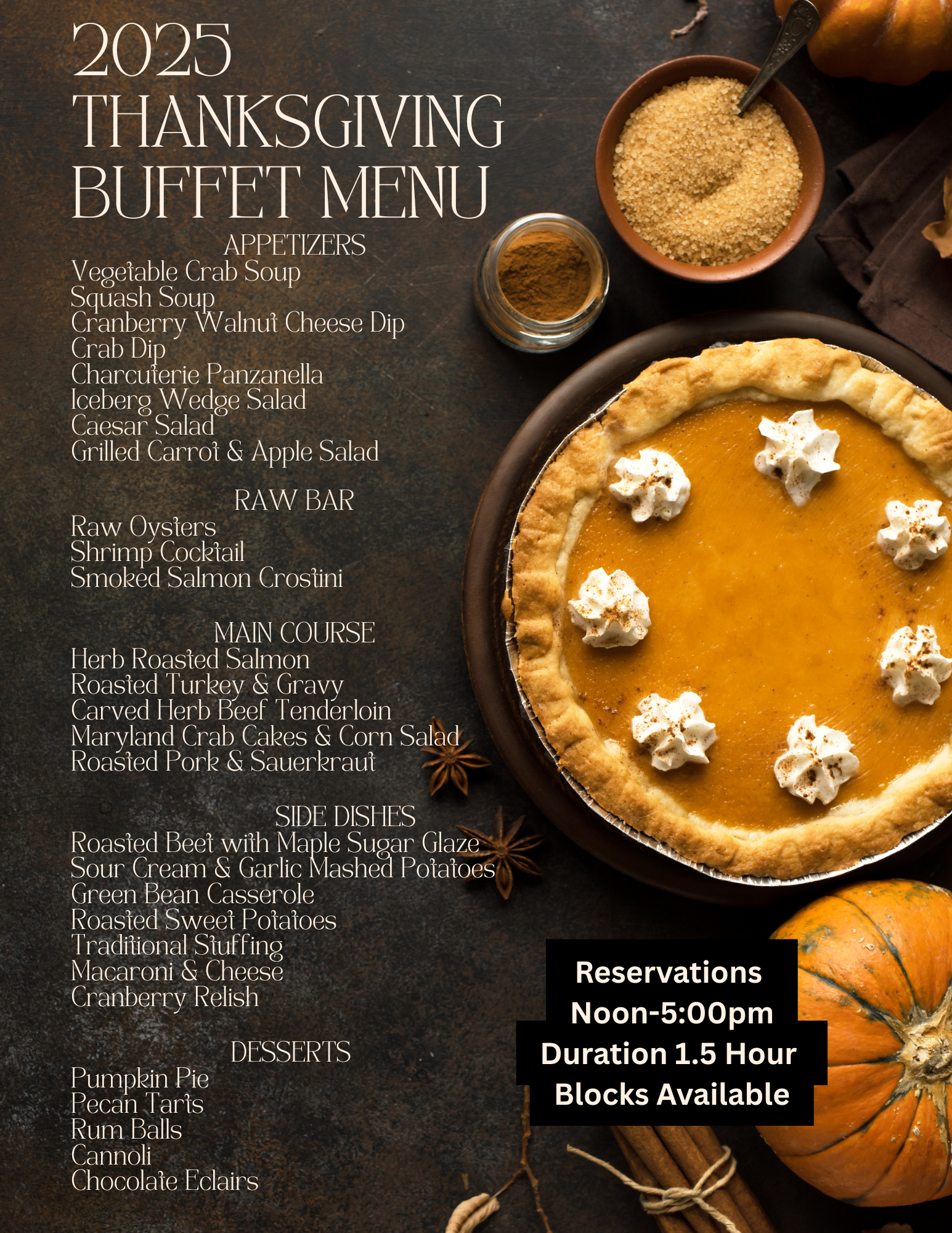 Severn Inn’s Thanksgiving menu is a higher price, but with the extra cost comes a buffet fit for a king. They have a broad selection of appetizers, entrees, side dishes, and desserts…even a raw bar! All with a gorgeous view of the Naval Academy bridge over the Severn River.