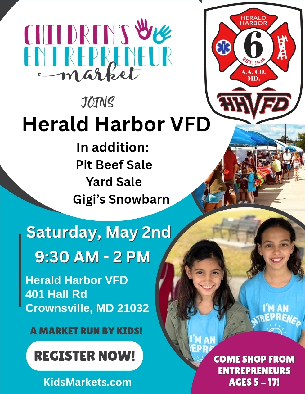 Come on out to Herald Harbor Family Market Day, featuring a yard sale, pit beef sale, and Gigi’s Snowbarn — plus the Children’s Entrepreneur Market!