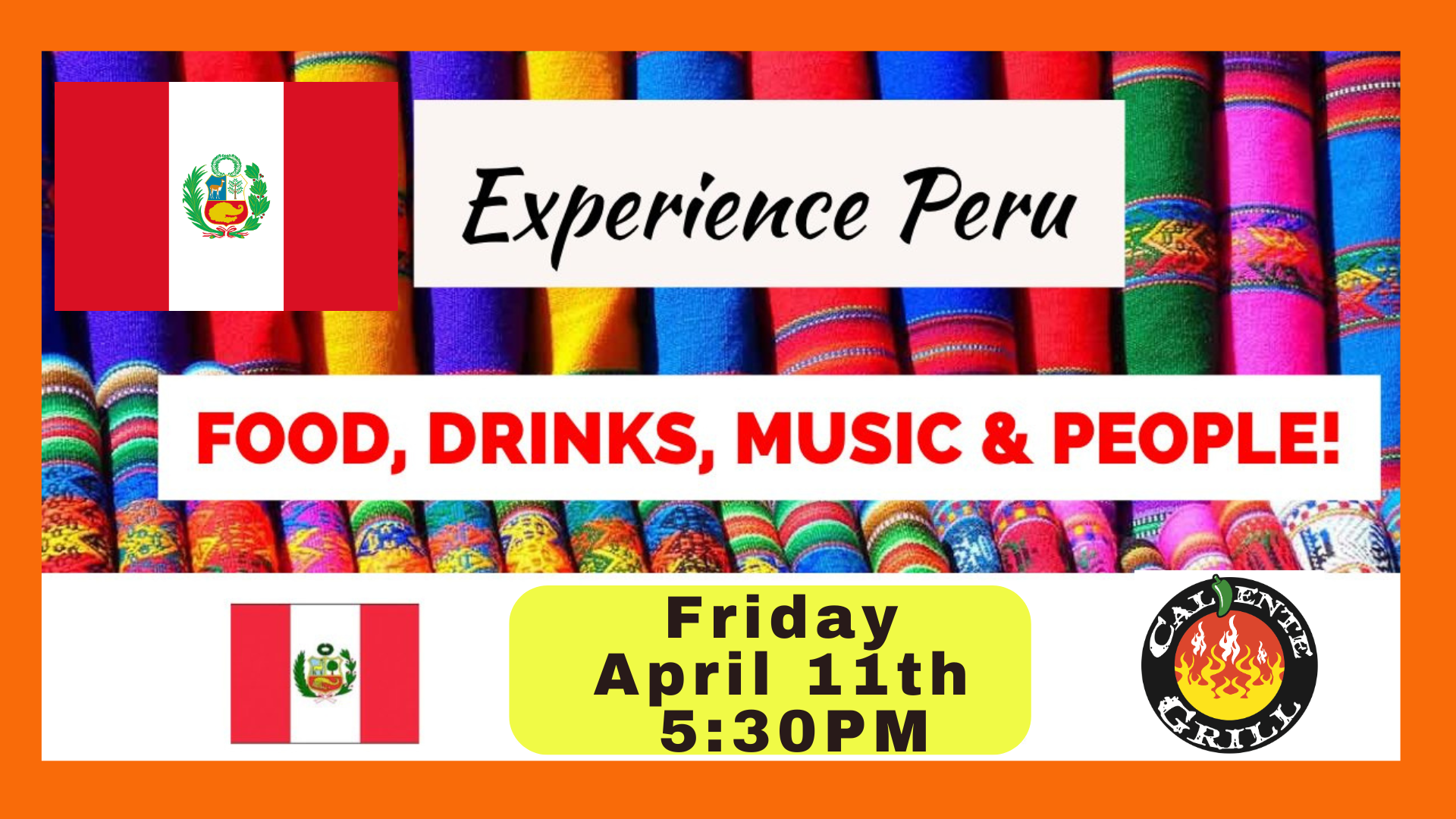 “Experience Perú at Caliente Grill”, a vibrant celebration of Perú’s rich culinary and cultural heritage. This special event will showcase authentic Perúvian cuisine, traditional music, and an immersive dining experience that highlights the bold flavors and warm hospitality of Perú. Guests will enjoy signature Perúvian dishes, handcrafted cocktails, and a festive atmosphere that brings the spirit of Perú to Annapolis. Join us for a night of delicious food, cultural appreciation, and unforgettable memories!