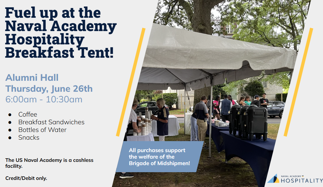 Join us at Alumni Hall at the US Naval Academy on Thursday, June 26th from 6:00am-10:30am at the Naval Academy Hospitality Breakfast Tent! Coffee, breakfast, snacks, and bottles of water will be available to fuel you and your family for I-Day and the exciting journey ahead!