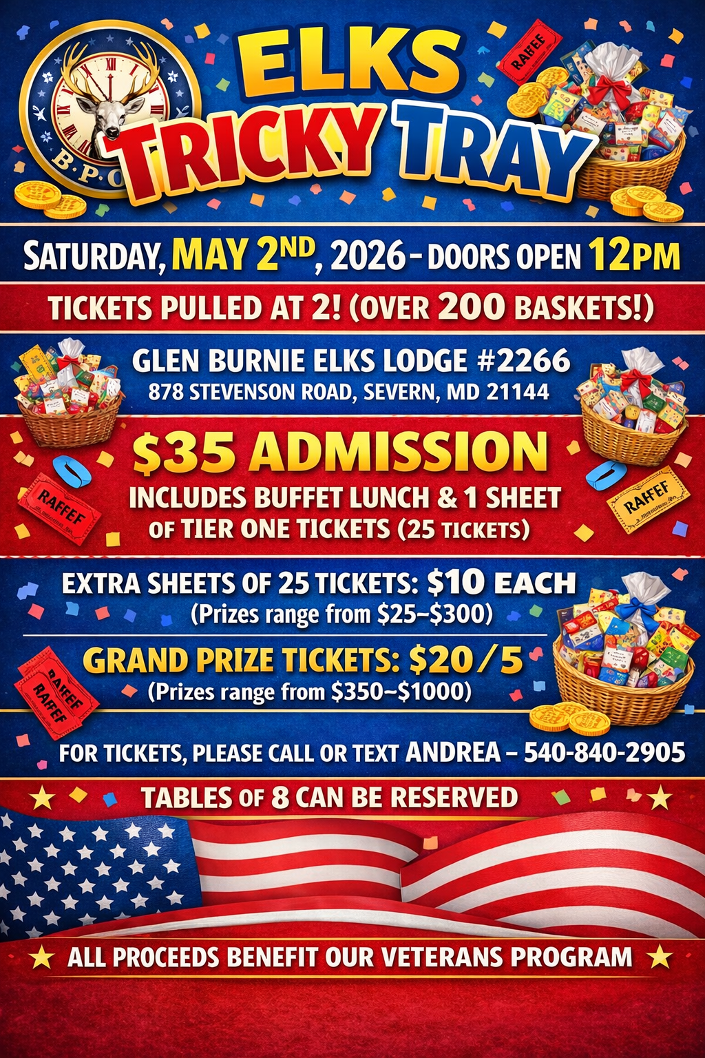 « All Events Tricky Tray May 2 @ 12:00 pm - 5:00 pm $35.00 « Mother’s Day Small Business Vendor Fair Thomas Point Lighthouse Cruise » OVER 200+ RAFFLE PRIZES RANGING FROM $25 TO OVER $1000. TICKET PRICE $35 INCLUDES BUFFET LUNCH AND 1 SHEET FOR 25 TICKETS. MORE TICKETS AVAILABLE TO PURCHASE THAT DAY. Share on FacebookTweetFollow us Add to calendar Google Calendar iCalendar Outlook 365 Outlook Live Details Date: May 2 Time: 12:00 pm - 5:00 pm Cost: $35.00 Event Categories: Activities, Charity, Fundraiser, Game Night Event Tags:bingo, charity, Elks, fundraiser, game night, Glen Burnie, tricky tray Website: https://www.facebook.com/events/d41d8cd9/tricky-tray/1188354293031790/ Organizer ANDREA SWANGLER Phone 540-840-2905 Email ANDREANJ67@AOL.COM Other Who Should Go? 21+ Name of User Adding Event Andrea Lee Swangler Email of User Adding Event ANDREANJ67@AOL.COM Venue GLEN BURNIE ELKS LODGE #2266 878 STEVENSON ROAD SEVERN, MD 21144 United States + Google Map Phone 540-840-2905 Related Events Annapolis Harbor & USNA Cruise April 15 Musikgarten April 15 @ 9:15 am - 10:00 am Jug Bay Preschool Explorers April 15 @ 10:00 am - 11:30 am