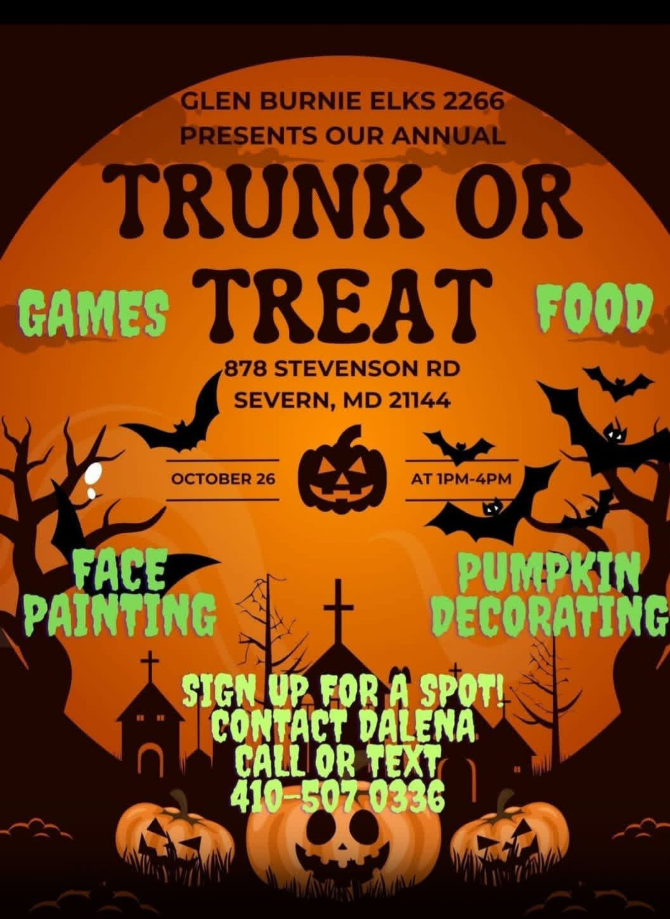 « All Events This event has passed. TRUNK OR TREAT – Elks Lodge Glen Burnie October 26, 2025 @ 1:00 pm - 4:00 pm Free « Make Your Own Monster Pumpkin Art by the Bay Reception » Free for all kids. Games, face painting, pumpkin painting, hot dogs, snow cones, and much, much more!!! Please come out and enjoy!!! Share on FacebookTweetFollow us Add to calendar Google Calendar iCalendar Outlook 365 Outlook Live Details Date: October 26, 2025 Time: 1:00 pm - 4:00 pm Cost: Free Event Categories: Activities, Halloween, Holiday, Kids Activities Event Tags:elks lodge, Family Friendly, Halloween, kids activities, trunk or treat Website: https://www.facebook.com/events/878-stevenson-rd-severn-md-21144-2230-united-states/glen-burnie-elks-2266-trunk-or-treat/1260852142025266/ Organizer Glen Burnie Elks Lodge Phone 410-507-0336 Email glenburnie2266@msn.com Other Who Should Go? Toddlers, Kids, Pre-Teens, Teens, Family Friendly Name of User Adding Event ANDREA SWANGLER Email of User Adding Event ANDREANJ67@AOL.COM Venue Glen Burnie Elks 878 Stevenson Road Severn, MD 21144 United States + Google Map Phone 410-507-0336 Related Events Annapolis Film Festival—Shorts Program 4: A Matter of Life & Death March 28 @ 8:45 pm - 10:45 pm Annapolis Film Festival: The Price to Pay (La Guerre des Prix) March 28 @ 9:00 pm - 10:45 pm Annapolis Film Festival: Chili Finger March 28 @ 9:15 pm - 11:30 pm