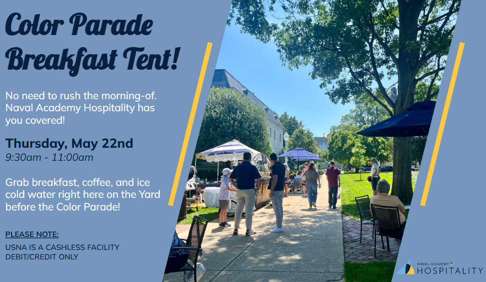 « All Events This event has passed. USNA Color Parade Breakfast Tent May 22 @ 9:30 am - 11:00 am Free « Smile Empty Soul & Tantric Crab Cake Station & Outdoor Bar » Grab breakfast, coffee, and ice cold water right on The Yard before the Color Parade during Commissioning Week! Share on FacebookTweetFollow us Add to calendar Google Calendar iCalendar Outlook 365 Outlook Live Details Date: May 22 Time: 9:30 am - 11:00 am Cost: Free Event Categories: Activities, Brunch, Food, Outdoor, Parade Event Tags:commissioning week, Naval Academy, Parade Website: https://www.usna.edu/CommissioningWeek/schedule.php Organizer Naval Academy Business Services Division (NABSD) View Organizer Website Other Who Should Go? Toddlers, Kids, Pre-Teens, Teens, Adults, 21+, Family Friendly Venue Naval Academy Club 2 Truxtun Road Annapolis, 21402 United States + Google Map Phone 410-293-2608 View Venue Website Related Events Jane Austen Afternoon Tea December 13 @ 2:00 pm - 3:00 pm Jingle Jubilee December 13 @ 3:00 pm - 7:00 pm Holiday Traditions Tour December 13 @ 4:00 pm - 5:00 pm