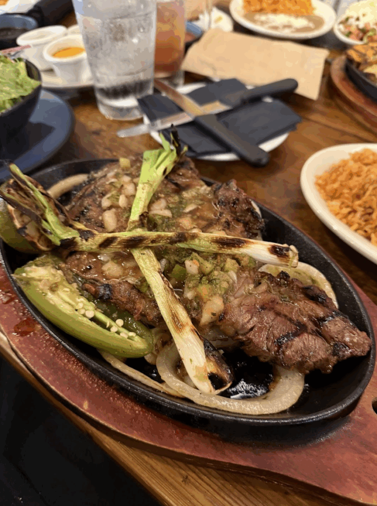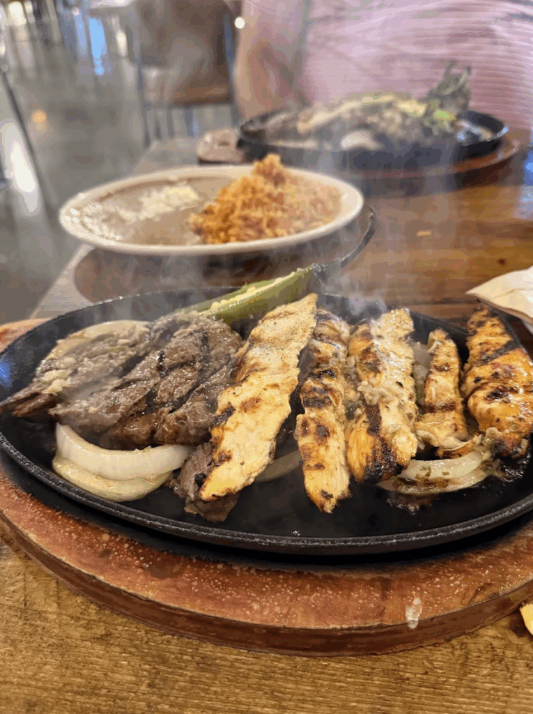 A giant marinated grilled steak served sizzling alongside beans, rice, grilled onions, and a crisp avocado salad. Every bite was rich, tender, and deeply satisfying.