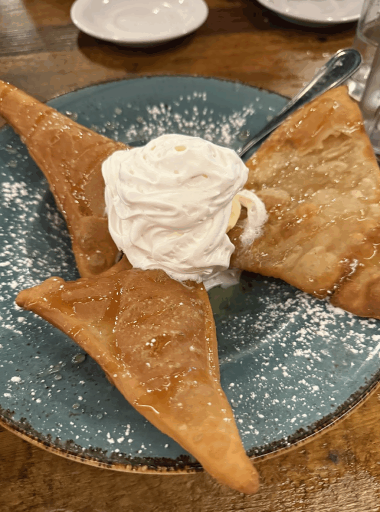 Fried dough triangles with a melting scoop of vanilla, drizzled with honey, and dusted with powdered sugar. This was the perfect, sweet ending. My husband and I debated on whether we would share with the kids.