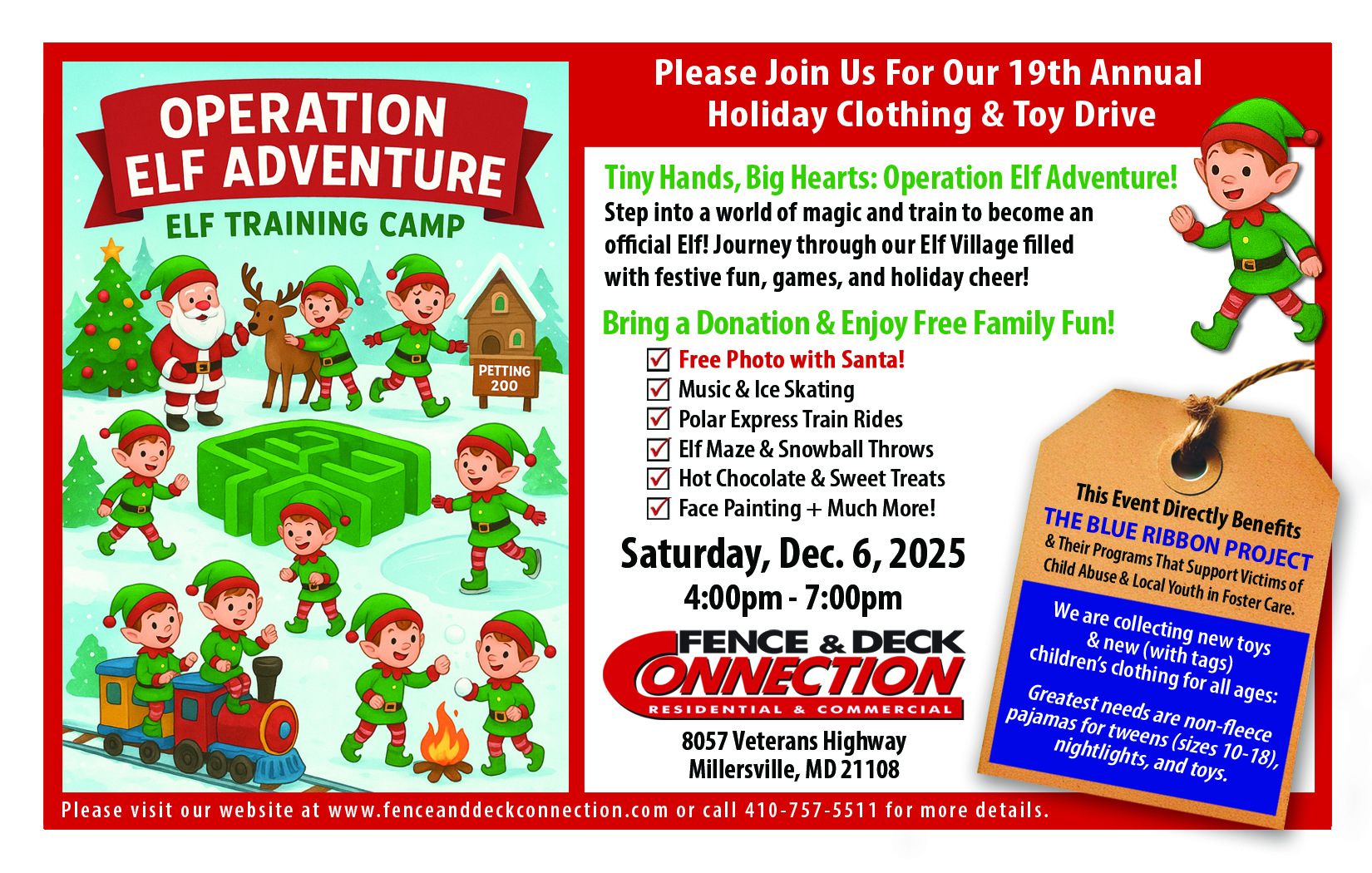 Fence & Deck Connection: Millersville 8057 Veterans Hwy, Millersville, United StatesAs we enter the season of giving, we are excited to announce our 19th Annual Holiday Drive: Operation Elf Adventure, taking place on December 6th, 4-7pm at our Millersville location. This joyous holiday event directly benefits The Blue Ribbon Project — an Annapolis-based organization offering several programs directly serving children who are the victims of …
