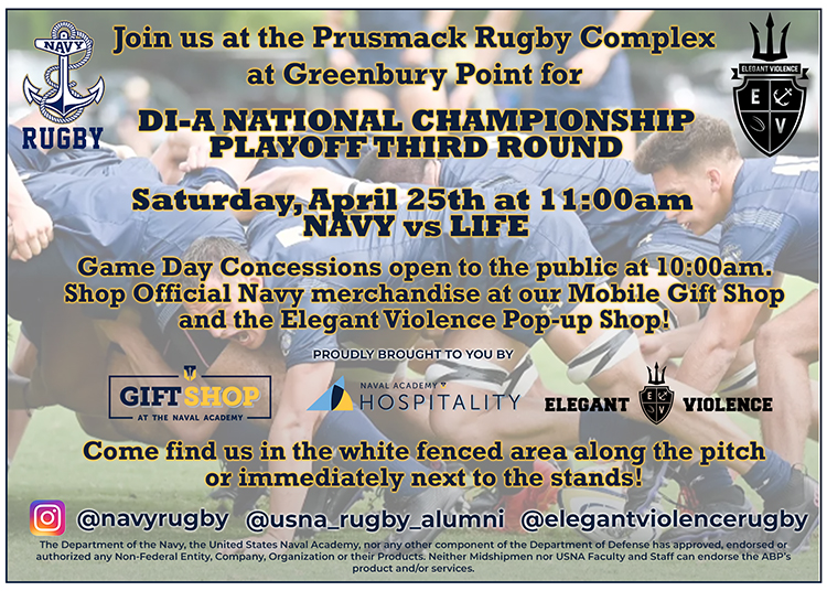 Greenbury Point Nature Center 265 Bullard Blvd, Annapolis, United StatesNavy Men's Rugby take on Life University in the DI-A National Championship 3rd Round. Game Day concessions and official Navy merchandise are available for purchase along the pitch and next to the stands - beginning at 10am. This event is free and open to the public!