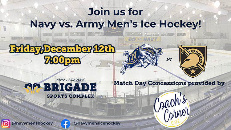Brigade Sports Complex 64 Greenbury Point Road, Annapolis, United StatesJoin us at the McMullen Arena at the Brigade Sports Complex for Navy Men's Ice Hockey as they take on Army! Match day concessions are brought to you by Coach's Corner!