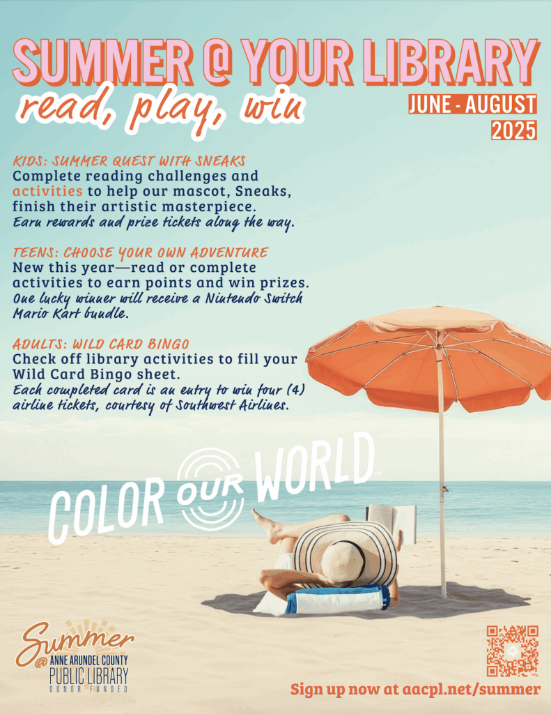 Stop by any of the 16 branches of the Anne Arundel County Public Library for a fun-filled summer! From now until August 31, kids can join the annual Summer @ Your Library Quest for a chance to win fantastic prizes like LEGO® kits, art sets, or musical instruments. Teens and adults can participate too—adults can play Wild Card Bingo for a chance to win four airline passes courtesy of Southwest Airlines, while teens can enter the Choose Your Own Adventure challenge for a shot at winning a Nintendo Switch Mario Kart bundle!