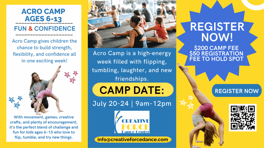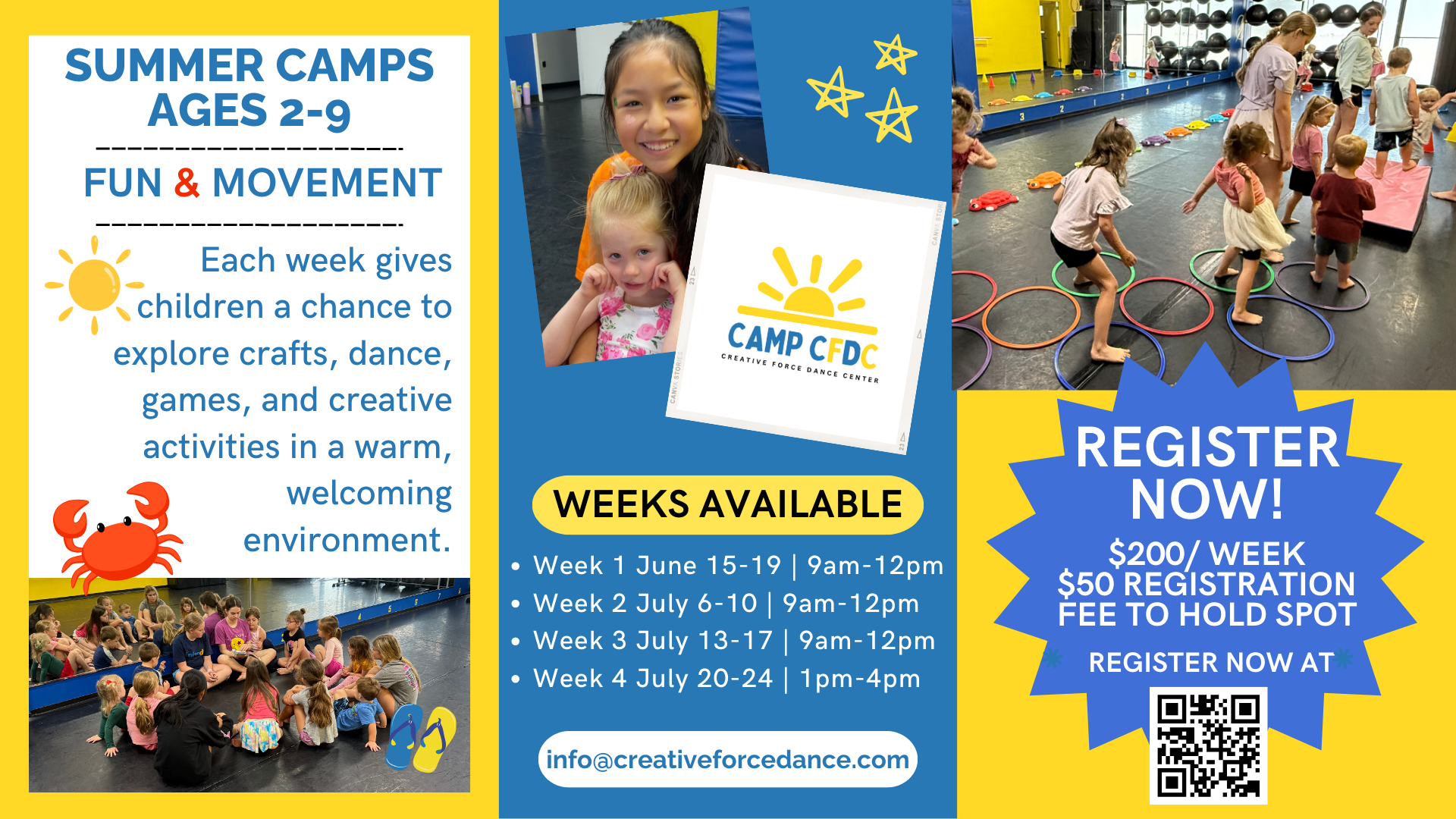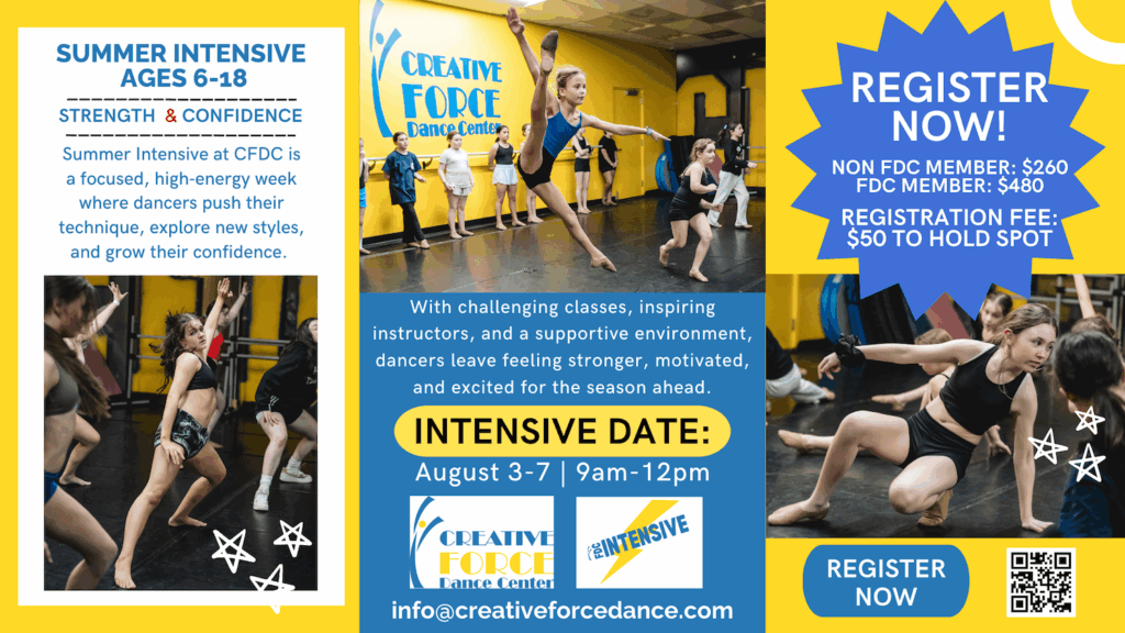 Our goal at Creative Force Dance Center is to educate students in the many styles of dance, exploring and combining both the mastery of movement and the artistry of expression.