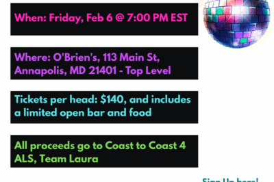 Please join us for a night of nostalgic ’80s musings with friends and family in support of fundraising efforts for Coast to Coast 4 ALS. To honor our inspiration, Laura, …