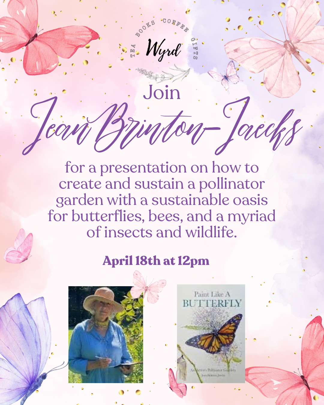 Wyrd Bookstore 135 Mitchells Chance Rd, Edgewater, United StatesJoin avid gardener, artist, and author Jean Brinton Jaecks for a lovely discussion about creating a pollinator friendly garden. Just in time for spring, let’s dig into great ideas and inspiration for creating harmonious gardens for all of us to enjoy!